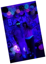 IlovephotobackdropsandthisBacktothe80’sonewas perfect.Theycreatesuchahugeimpact,goalongwayto incorporateyourpartytheme,andareagreatwaytoget yourpartygoerstotakepictures.Thiswallgreetedallthe guestsastheycameintotheparty.Sincewedecidedon an80’scolorfulneon-glowthemeforthepartyIcreated thesecuteneonrubikscubesusingneonpaperIcutin squarestogoalongwithourballonarch.Iwilladmit,this wasmyfirstballoonarchandclearlyIamnotaprofessional balloonartist.Butatnight,oncetheblacklightsgotgoing thebackdropandblacklightballoonstookonalifeoftheir ownanditwastotallyawesome!Wegotthewholeparty togetherforaphotoandeachcouplehadtheirphotostaken in front of it.