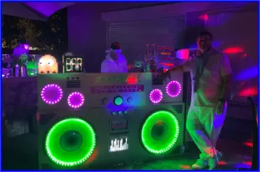 Thiswasoursignaturepieceforthisparty.Oncewe startedlookingatdoingan80’spartyoneofthethingswe wantedforsurewasaBoomboxbar.Somyhusbandand Istartedplanningandlookingatideasofhowwecould recreateoneforourselves.Ittookusafewmonths, workingonlyacouplehoursatatime,toputthistogether.Wewerebothreallyhappywithhowitturnedout.Hereis a tutorial for how we made this Boombox Bar.