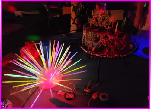 What80’spartyiscompletewithoutaPac-Mangame?We orderedan80’sstylevideogameconsolefortheparty.The firstgamethatweorderedwasn’tworkingproperlysothey swapedusoutforthisone.ThePac-Manmachinewasa bighitwiththeadultsandyoungadults.Wealsousedour BucketBouncegame(fromtheFallCarnivalcollectionof games).WesetupatentcompletewithBlacklights(and againItotallyforgottogetapictureofthisatnight).The spacethemeofBucketBouncewithalltheLEDlightsmade it a great addition to the 80’s party.